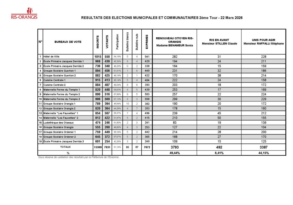 * Liste : Renouveau citoyen Ris-Orangis Madame Sonia Benameur : 3793 voix – 49,44%